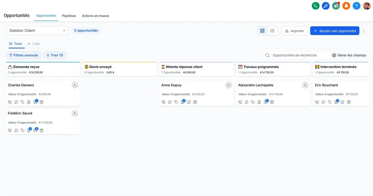 Chaque contact a son statut : "Demande reçue", "Devis envoyé", "Attente réponse client", "Travaux programmés", "Intervention terminée". D'un simple coup d'œil, vous savez qui relancer, qui programmer, qui facturer. Plus aucune vente ne passe entre les mailles du filet.